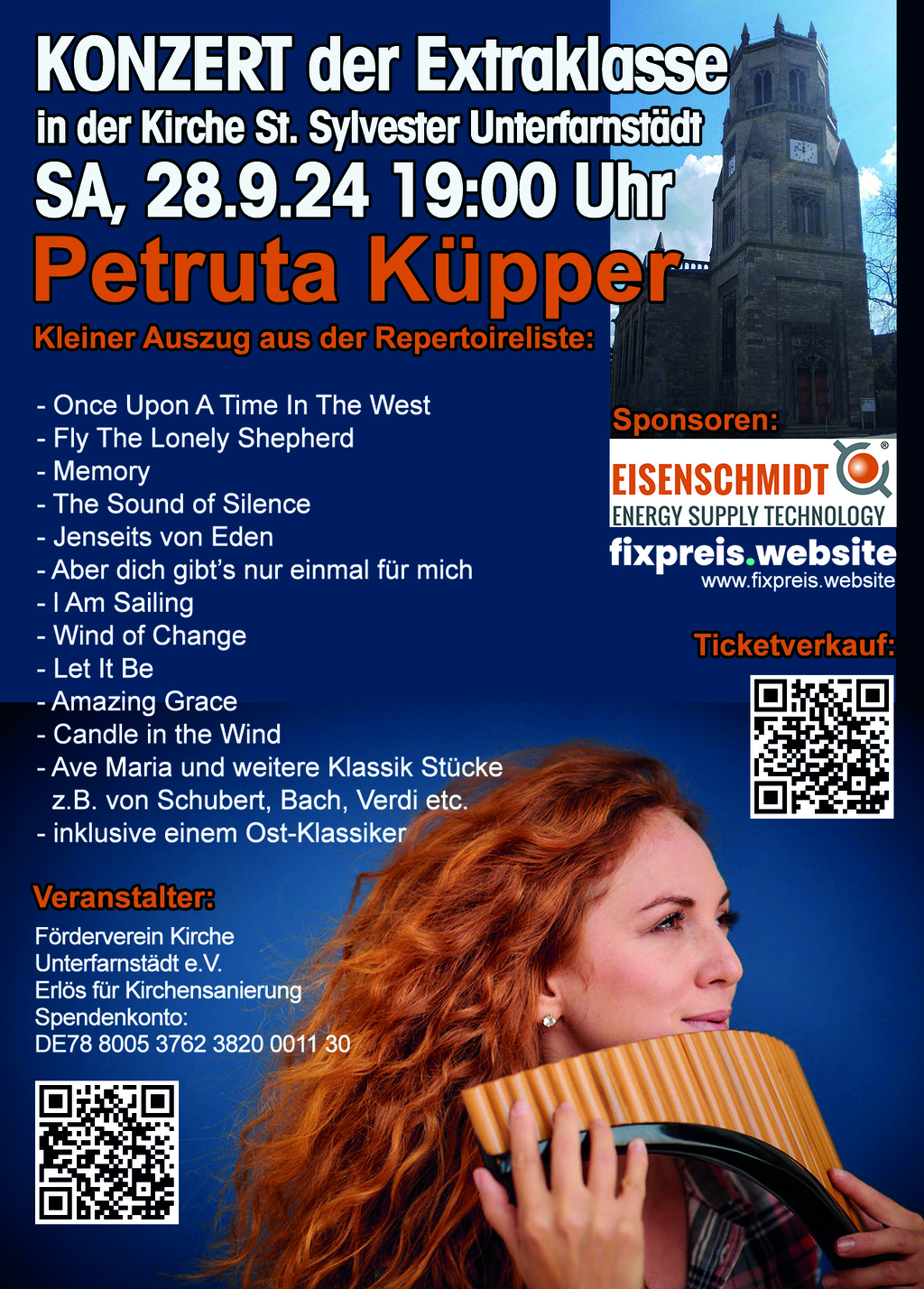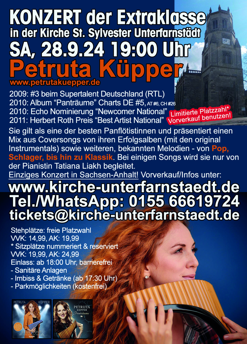 3x 2 Ticket/VIP-Plätze mit Imbiss für das Konzert der Extraklasse in der Kirche St. Sylvester Unterfarnstädt am SA, 28.9.2024 um 19:00 Uhr mit Petruta Küpper. Die Plätze befinden sich direkt bei der Bühne, Einzelstühle bei «Gäste/Presse» (siehe Plan). Ebenso gibt es pro Person einen kostenlosen Imbiss und ein kostenloses Getränke nach Wahl (vom Angebot vor Ort).