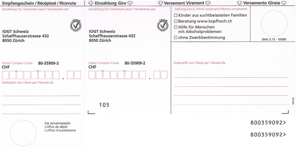 Einzahlungsschein rot: 80-35909-2 / IOGT Schweiz, 8050 Zürich