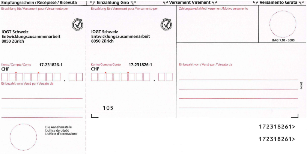 IBAN CH84 0900 0000 1723 1826 1 / IOGT Schweiz (EWZA), 8050 Zürich